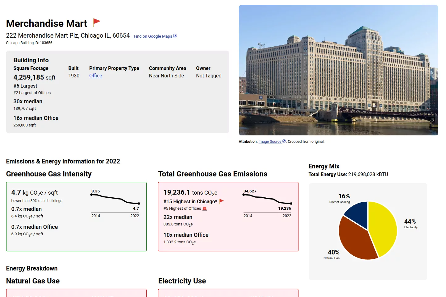 that Merch Mart's energy use is 44% electricity, 40% fossil gas, and 16% district