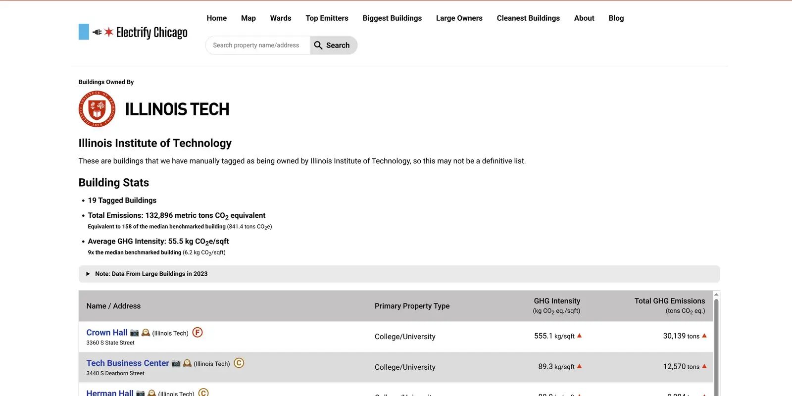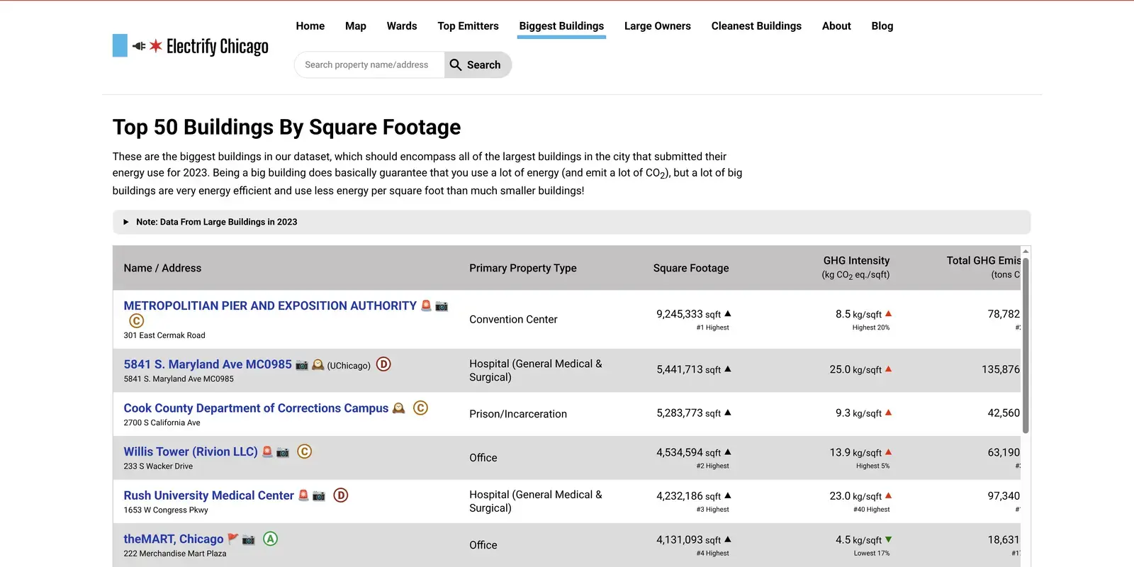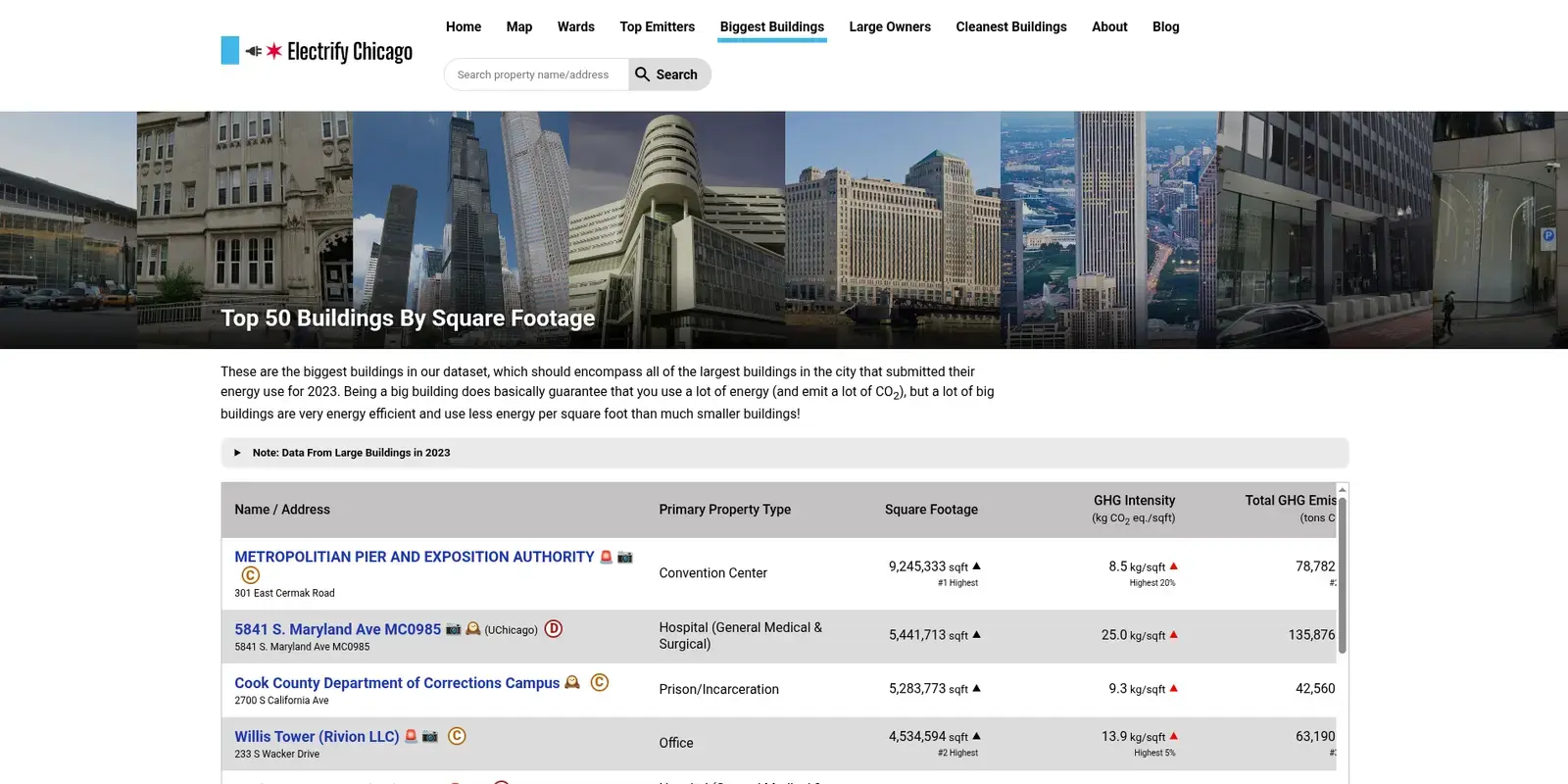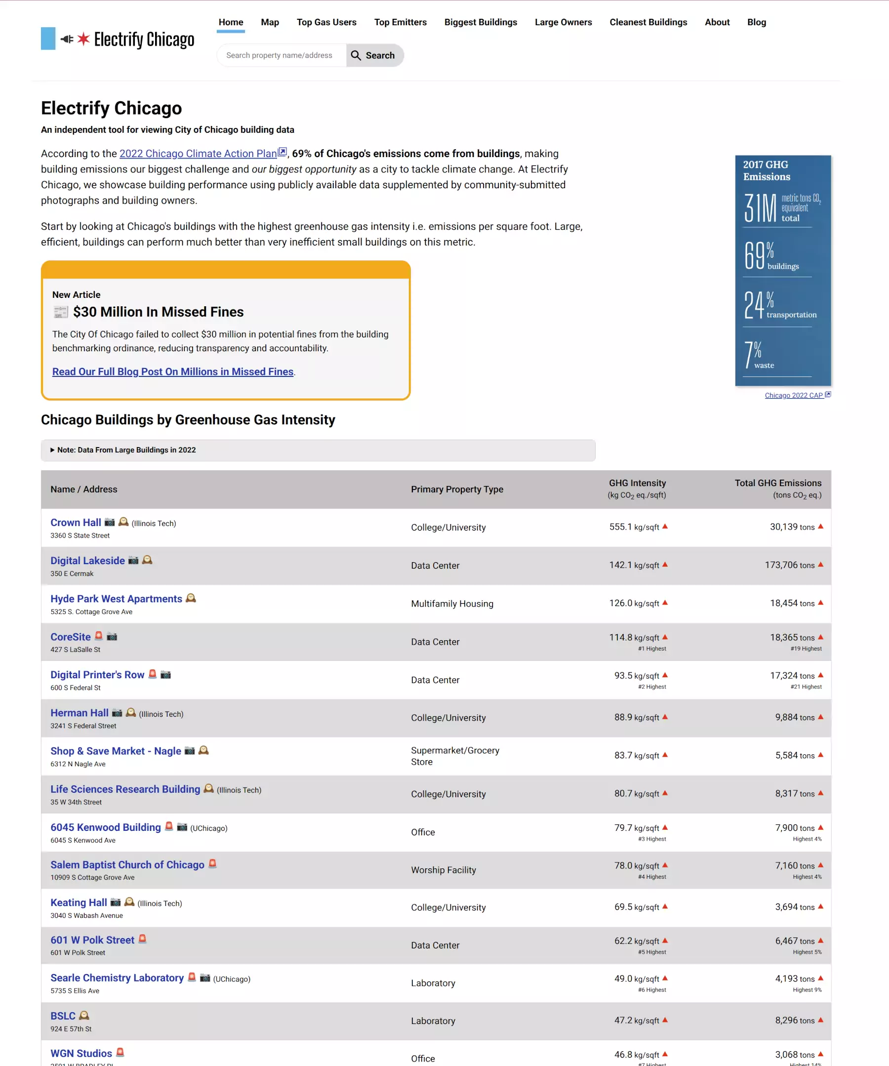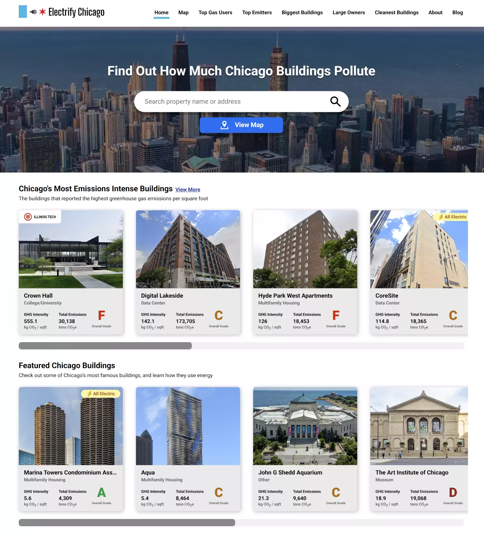 The Electrify Chicago homepage showing Chicago's most emissions intense