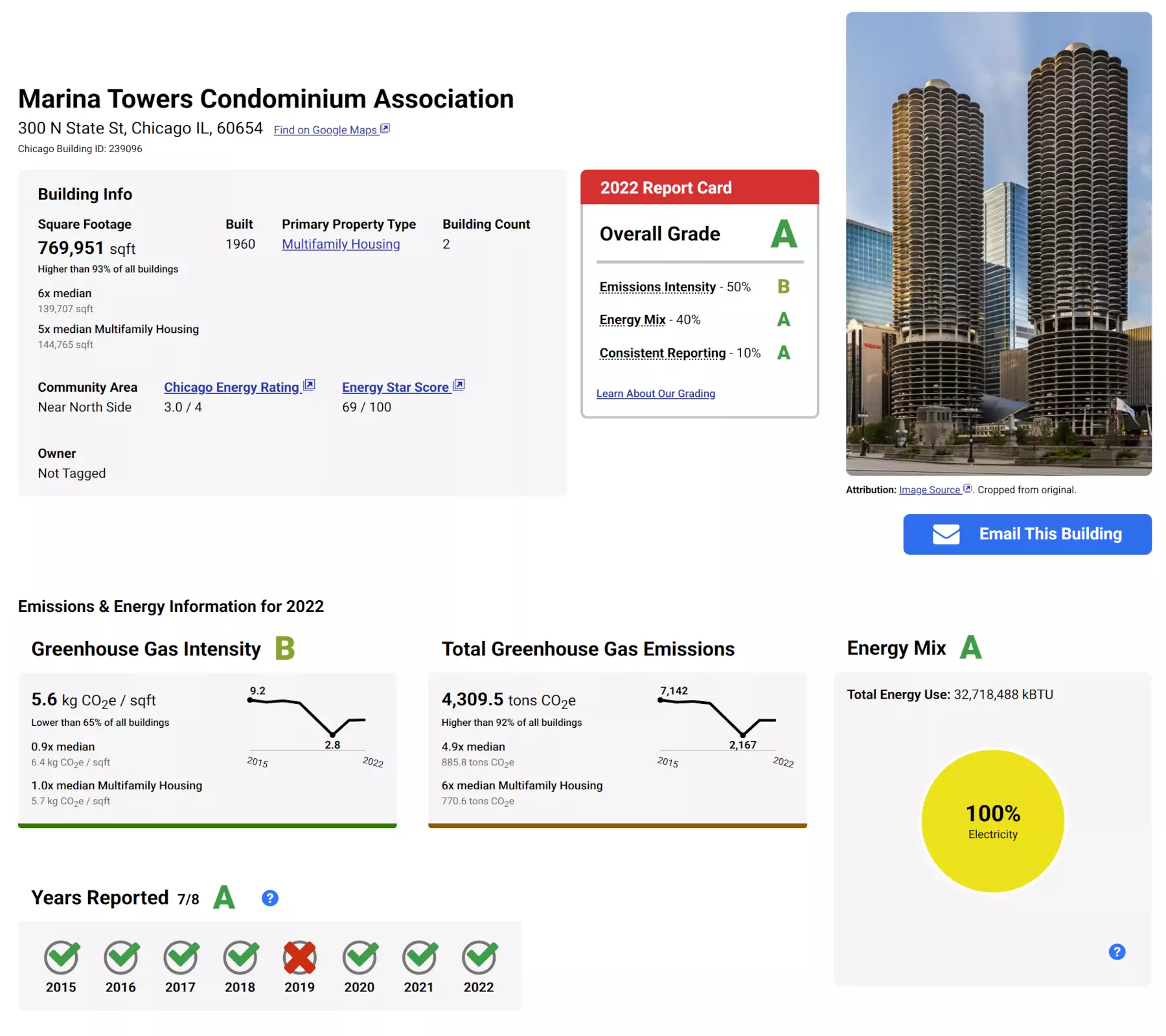 Electrify Chicago's Marina Towers page, showing it has an overall A, a B under