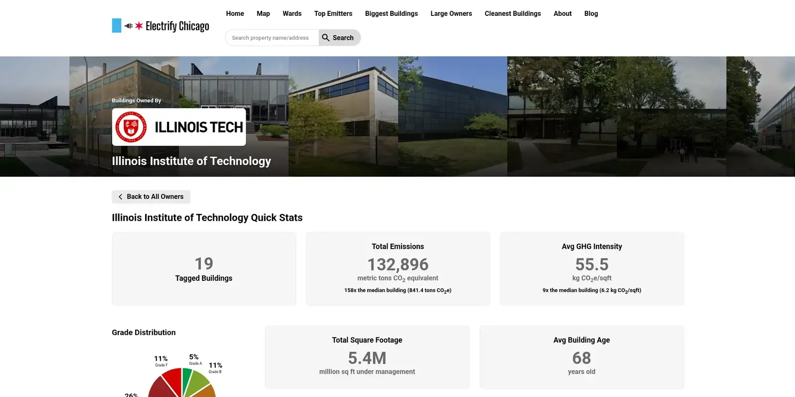 Building owner pages now also include additional statistics and graphs to help you better understand each owner's environmental impact, including total square footage, total emissions, average greenhouse gas intensity, and a breakdown of their buildings' grades.