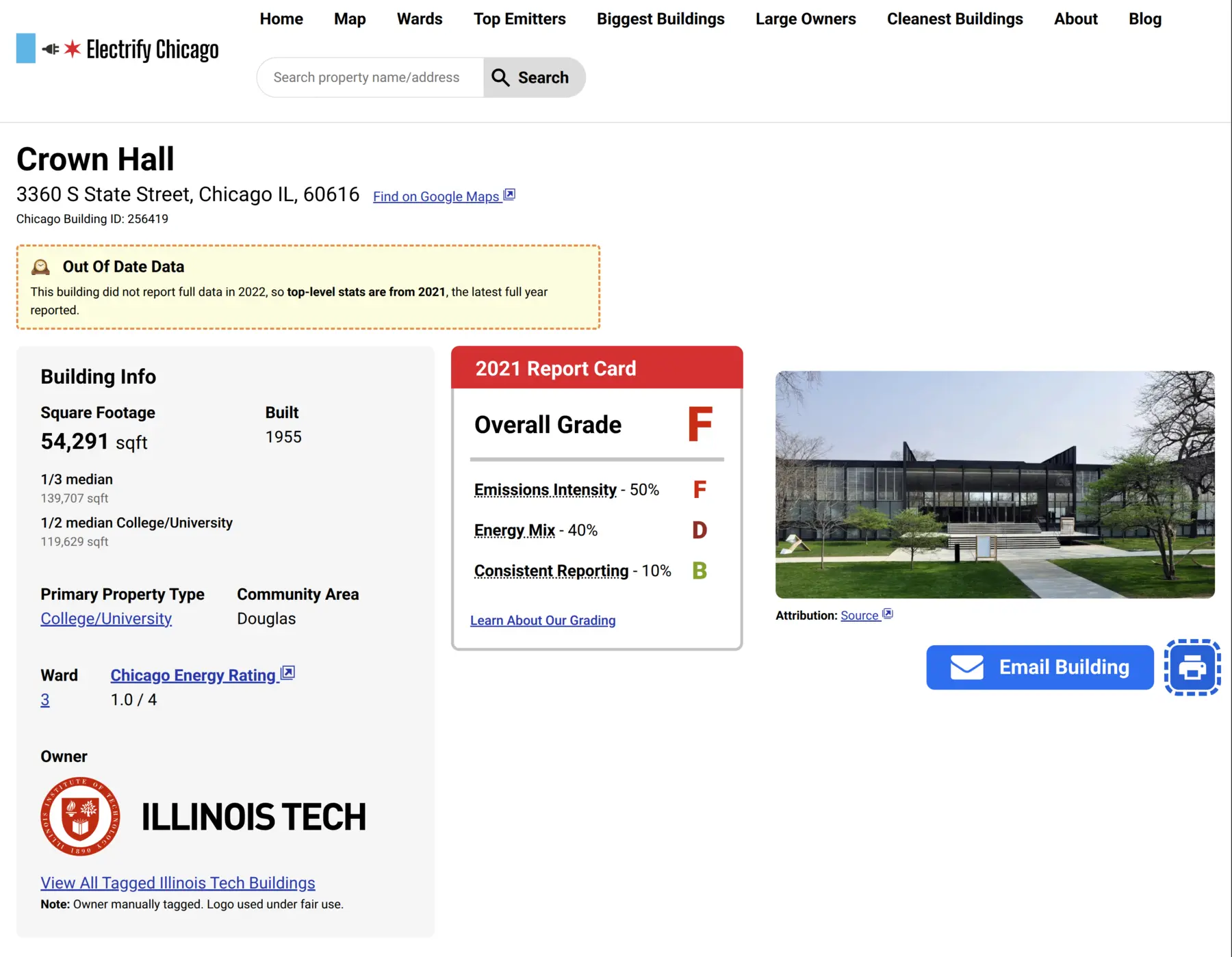 buildings and some featured Chicago buildings, with Crown Hall getting an F,